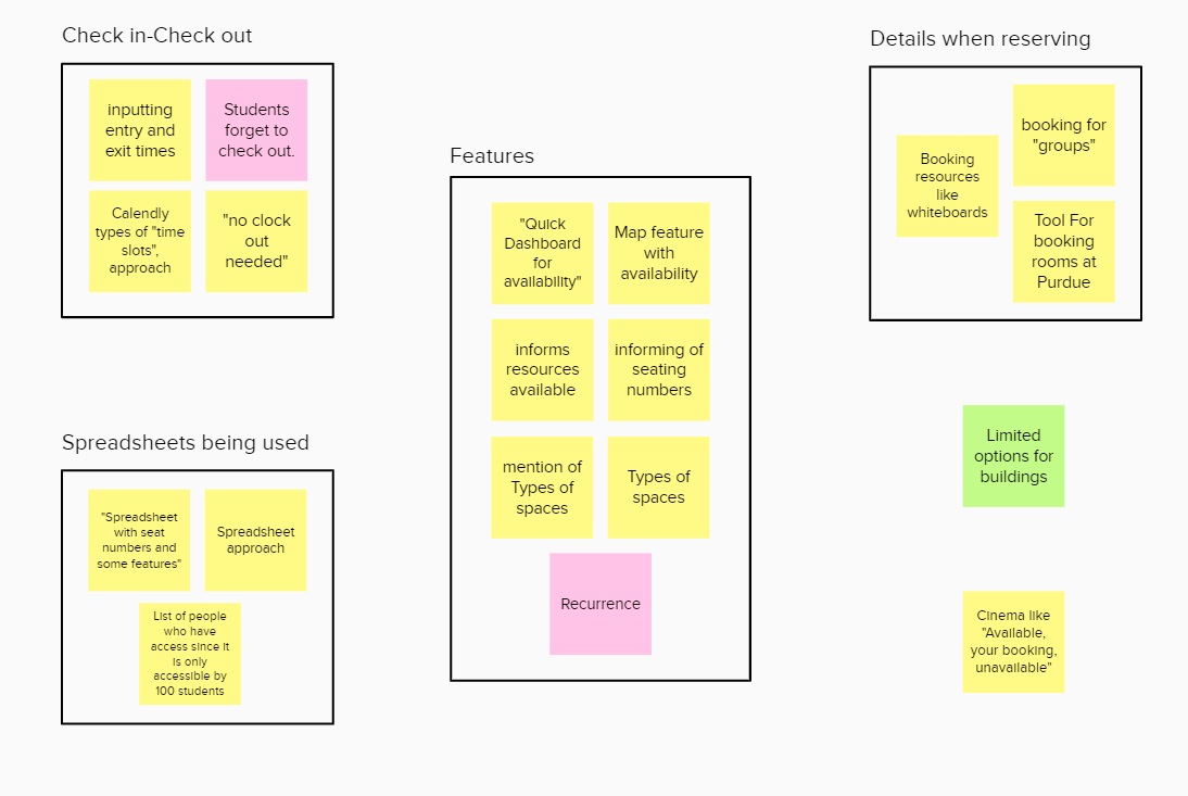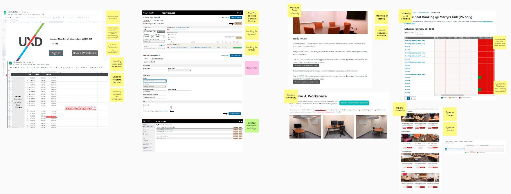 I chose to look into what kinds of solutions have universities across the world been using for similar situations. I looked at what Purdue has been doing for some exclusive spaces like the UX studio which few have access to. Following this I affinity diagrammed my findings.