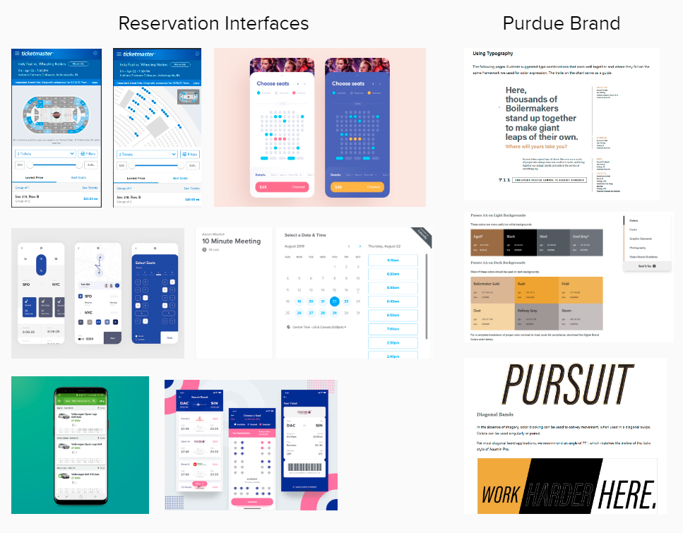 I looked at reservation interfaces for arenas, airplanes, theatres and even Zipcar because it had a college context to it.